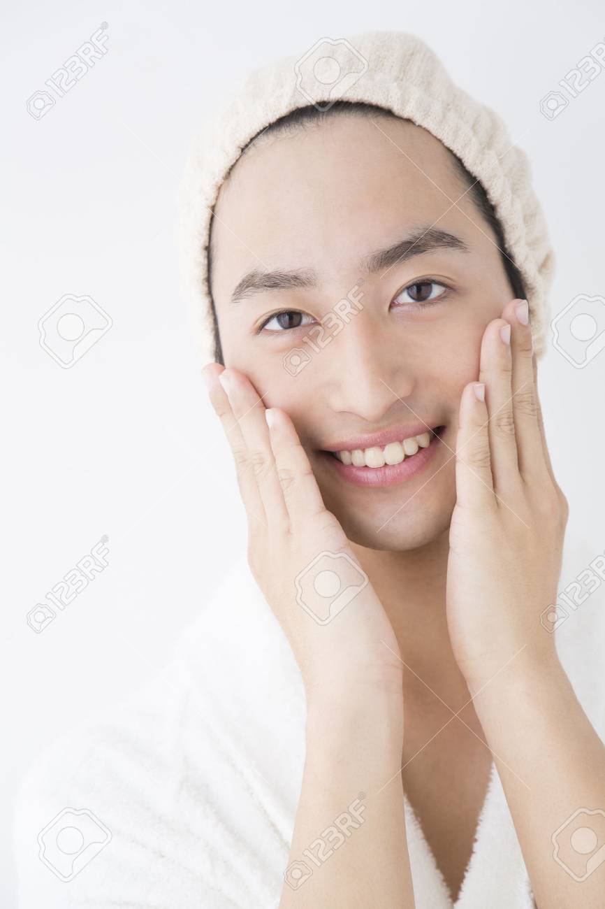洗面所で頬に手を当てる若い男性の写真素材 28263838 Pixta